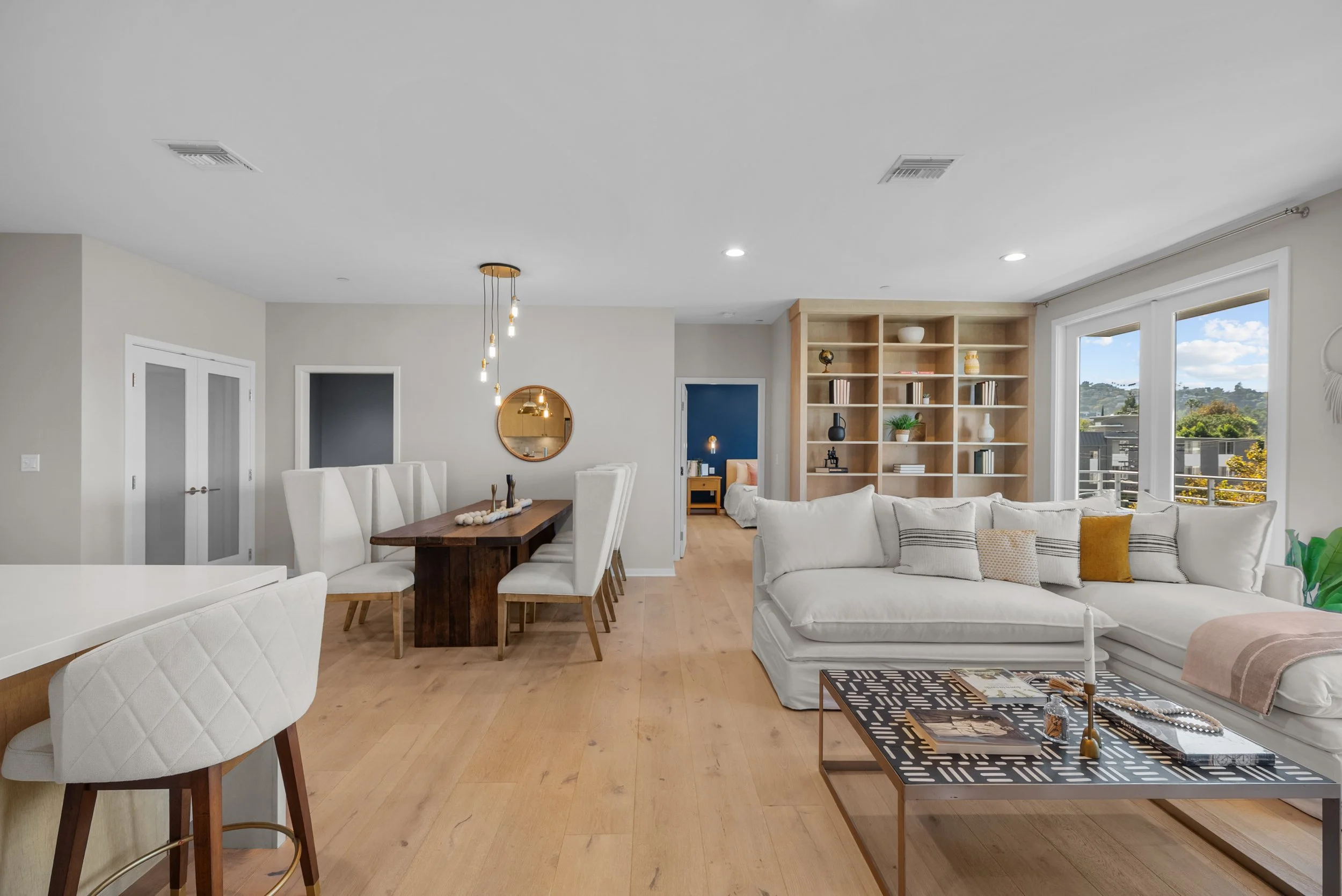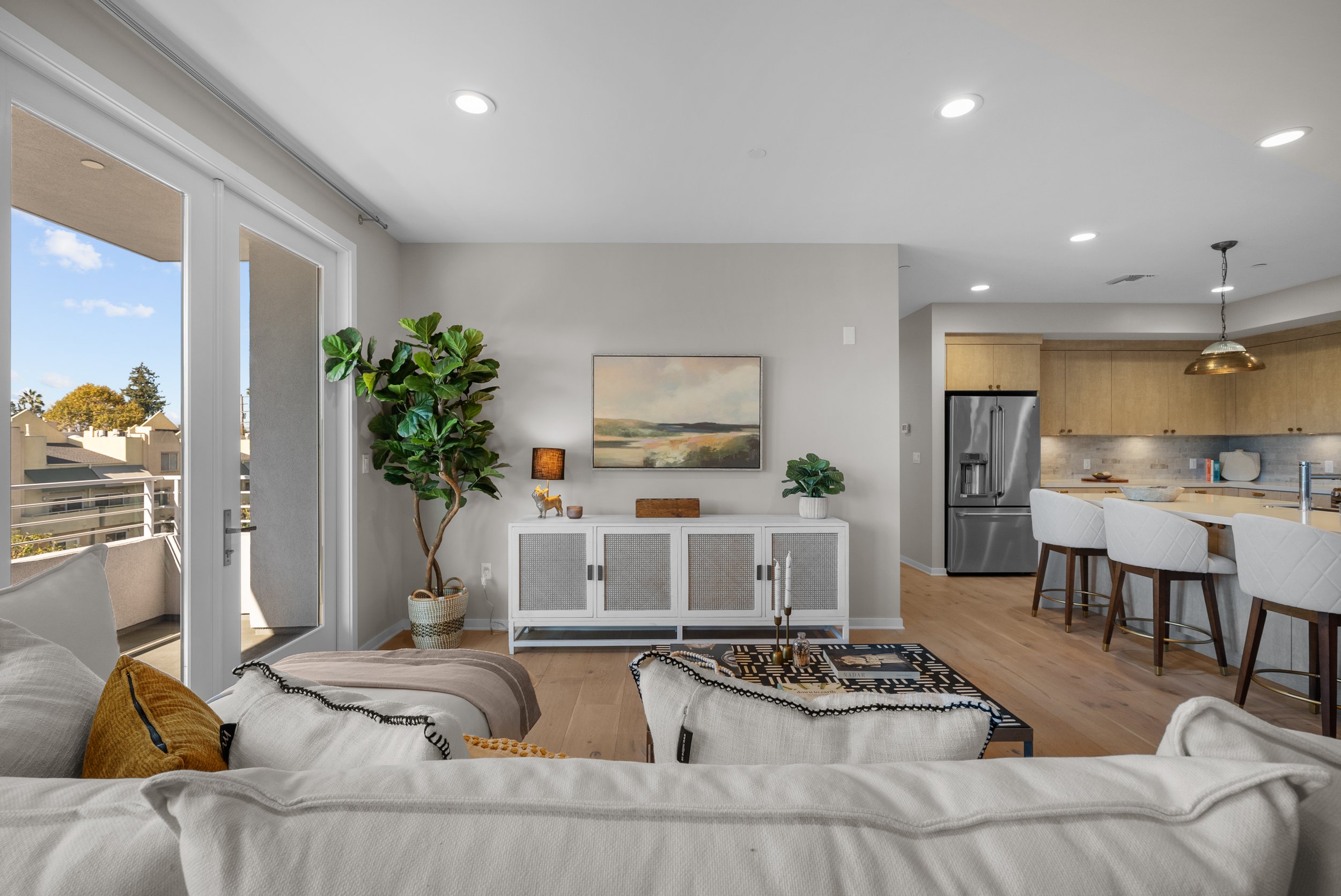 Stunning luxury front-facing Penthouse 401 in Studio City offers modern sophistication and elegance. Built in 2017, it features 9 ft. ceilings and wide-plank oak floors. The spacious living and dining areas open to a private balcony with lush treetops and mountain views. The sleek kitchen includes GE Caf appliances and Caesarstone countertops. The residence features two master bedrooms with luxurious en-suites; the primary retreat offers a fabulous walk-in closet, double vanity, freestanding tub, and spa-like shower. A versatile third bedroom/office offers ample storage. Enjoy in-unit laundry and two car parking in a gated garage. Building amenities include a security system, fitness center, meeting room, sundeck with BBQs, and a bike room. Located in the Carpenter School District and just a block from Ventura Place's popular spots like Joan's on Third.